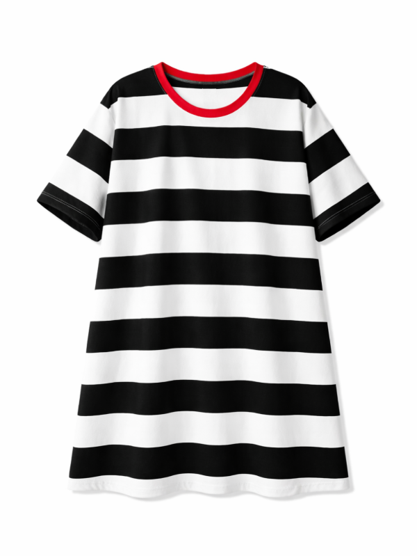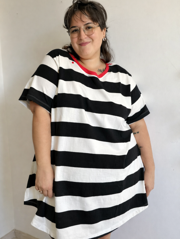 El diseño a rayas blanco y negro es un clásico eterno que nunca falla, y el calce amplio lo convierte en ese comodín que te ponés una vez… y no te sacás más.